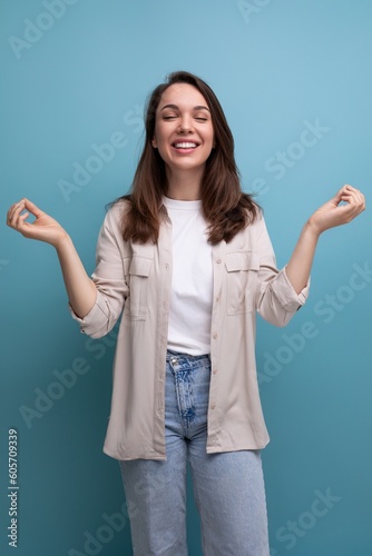optimistic brunette young brunette lady dressed in shirt and jeans
