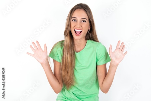 Optimistic young beautiful woman wearing green T-shirt over white background raises palms from joy, happy to receive awesome present from someone, shouts loudly,
