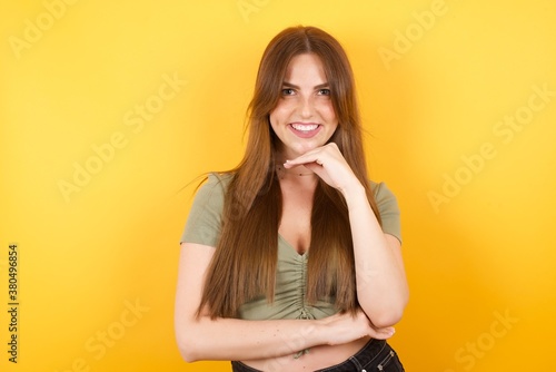 Optimistic Young caucasian woman with long hair wearing green tshirt standing over isolated yellow keeps hands partly crossed and hand under chin, looks at camera with pleasure. Happy emotions concept
