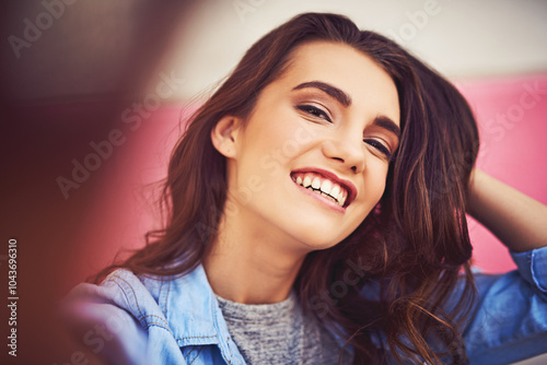 Outdoor, woman and happy on portrait with fashion for social media, post and profile picture. Female person, gen z and smile or confident on break as student with fun, swag and trendy clothes
