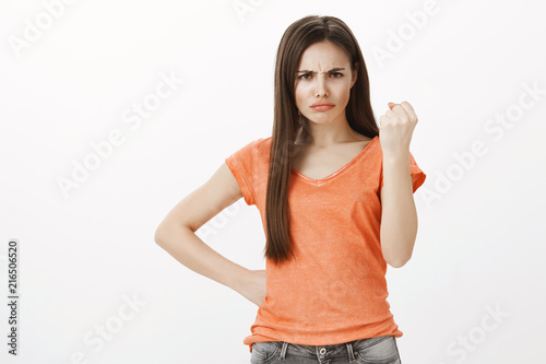Outraged timid girl wanting respect. Indoor shot of offended upset cute woman in orange t-shirt, holding hand on hip and raising clenched fist, frowning from insult and displeasure over gray wall