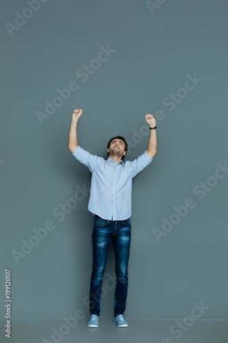 Overwhelmed by emotions. Positive nice joyful man smiling and looking up while being overwhelmed by emotions