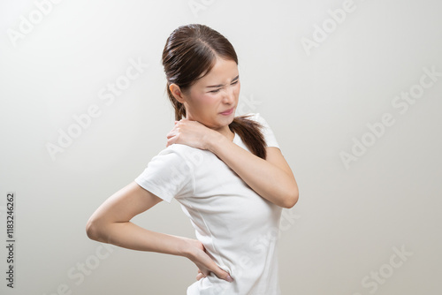 Pain body muscles stiff problem, asian young woman, girl painful with back, neck ache from work hand holding massaging rubbing shoulder hurt, sore on white background. Health care and medicine concept