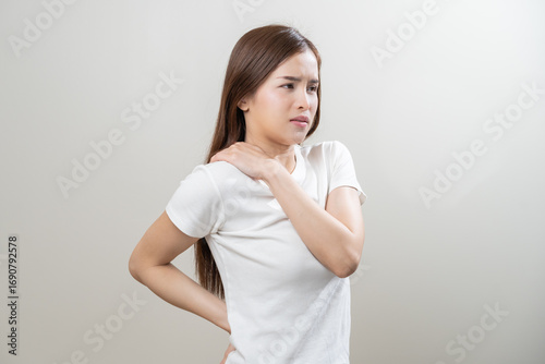 Pain body muscles stiff problem, asian young woman, girl painful with back, neck ache from work hand holding massaging rubbing shoulder hurt, sore on white background. Health care and medicine concept