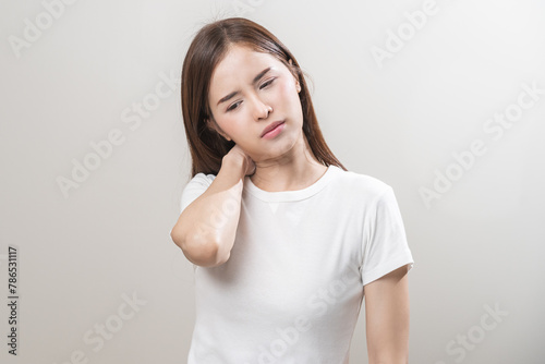 Pain body muscles stiff problem, asian young woman, girl painful with back, neck ache from work hand holding massaging rubbing shoulder hurt, sore on white background. Health care and medicine concept