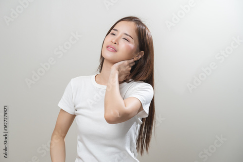 Pain body muscles stiff problem, asian young woman, girl painful with neck pain body ache from work, holding massaging rubbing shoulder hurt, sore on white background. Health care and medicine concept