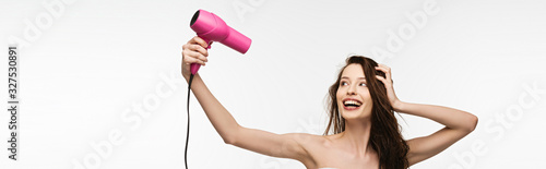 panoramic shot of cheerful girl drying hair with hair dryer isolated on white