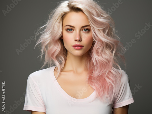 Pastel colors, studio lighting, clean design - a beautiful e-commerce photograph of a white attractive lady against a flat background.