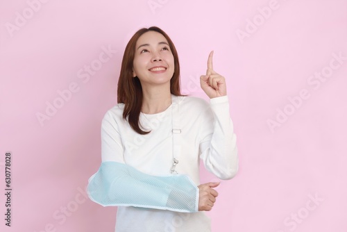 Patient with broken arm in sling, Asian woman in casual white shirt broken hand wearing an arm brace standing over pink background with copy space.