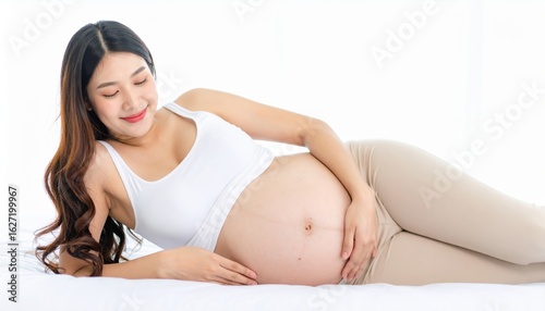 Peaceful slumber, pregnant woman finds comfort and rest on a cozy bed serene