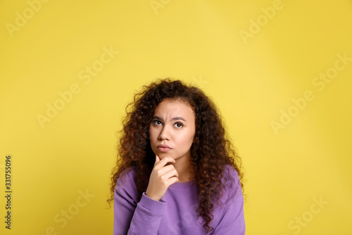 Pensive African-American woman on yellow background. Thinking about difficult question