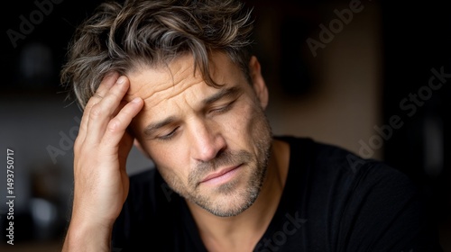 Pensive mans introspective moment hand on brow
