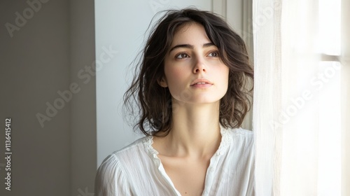 Pensive young caucasian female looking out window