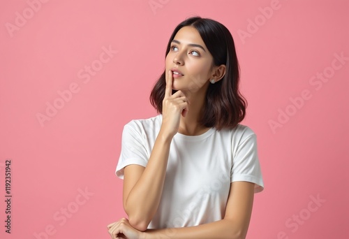 Pensive young woman in casual white t-shirt posing isolated on pink wall, studio portrait. People emotions lifestyle concept. Mock up copy space. Put hand prop up on chin, looking up
