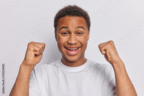 People and emotions concept. Cheerful dark skinned African guy clenches fists rejoices good news feels very happy dressed in casual t shirt isolated over white background glad to be promoted