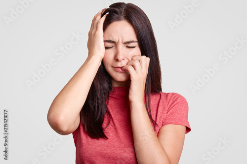 People and sadness concept. Stressed brunette female keeps eyes closed, touches head, feels pain, being in panic after divorce with husband, dressed in casual t shirt, isolated over white studio wall