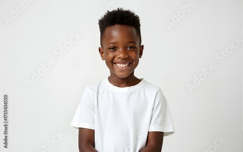 People, childhood, school age and lifestyle concept. Horizontal studio image of handsome adorable African American schoolboy dressed in white t-shirt, looking at camera with broad happy smile