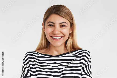 People, lifestyle, joy, fun and happiness concept. Isolated shot of beautiful fashionable young woman wearing black and white striped top enjoying nice day, looking at camera with happy smile