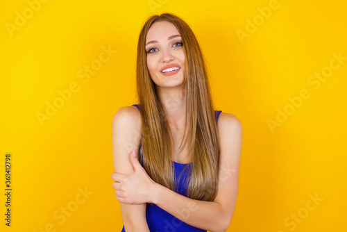 People, lifestyle, youth and happiness concept. Shy pretty girl feeling happy after boy who she likes invited her out on date.