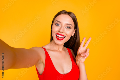 People person lifestyle facial emotion expressing delight concept. Close up photo portrait of pretty cute nice glad charming stunning lady giving v-sign isolated background