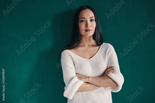 Perfect in every way. Beautiful young woman looking at camera and smiling while standing against green background
