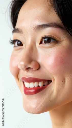 Perfect lips of an Asian girl, lipstick color Mocha mousse. Smile. Close-up. Natural beauty