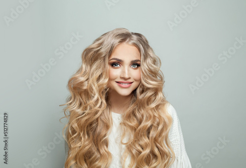 Perfect young woman blonde model with natural makeup, long healthy silky wavy hair and cute smile posing against white studio wall banner background with copy space