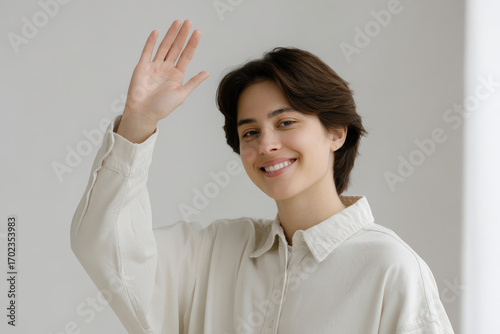 person demonstrates friendly greeting gesture with enthusiastic smile conveying warmth