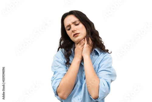 Pharyngitis first symptoms throat ache. Sick attractive girl touches throat with pain. Seasonal illness medecine.