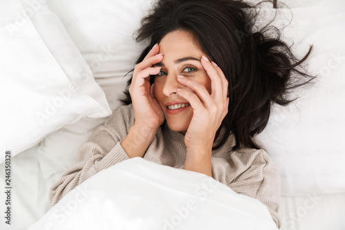 Photo from above of attractive woman 30s, smiling while lying in bed at home