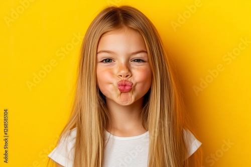 Photo of a beautiful woman with long, straight blonde hair, wearing casual and pouting her lips, isolated on a yellow background with copy space. Portrait of a young girl looking at the camera and mak