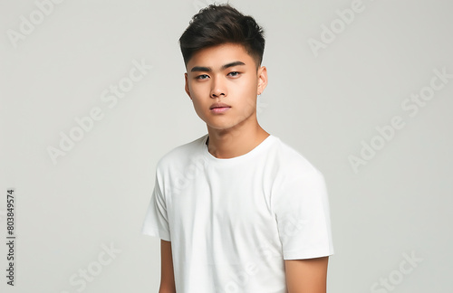 Photo of a handsome young Asian man wearing a white t-shirt, with clean and smooth facial skin, brown hair, posing in front of the camera against a white background