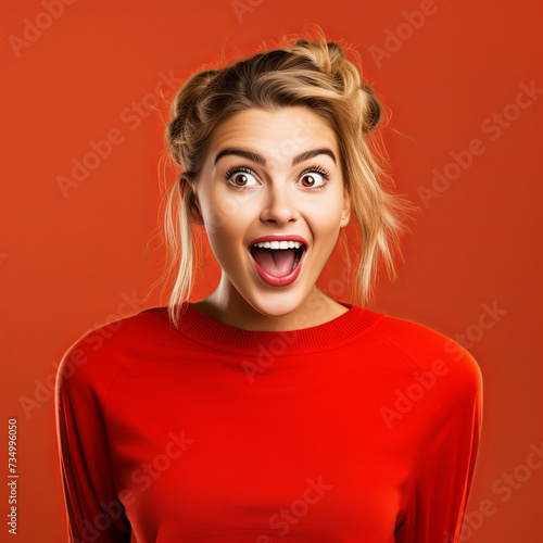Photo of a surprised cheerful young woman of European appearance, isolated on a red background. Mental state, delight, impression, surprise, admiration
