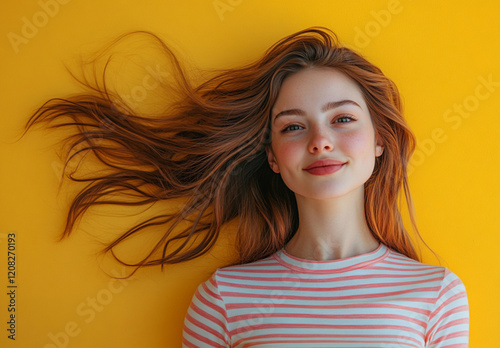 Photo of a woman with flowing hair, wearing a striped shirt against a yellow background, looking at the camera with a cute expression