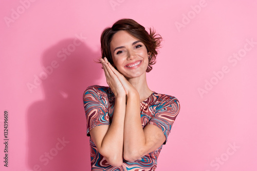 Photo of adorable cute pretty nice girl wear stylish clothes touch face isolated on pink color background