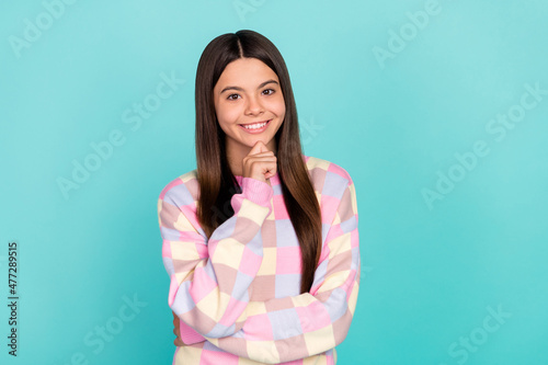 Photo of adorable intelligent school girl dressed prink pullover arm chin smiling isolated teal color background