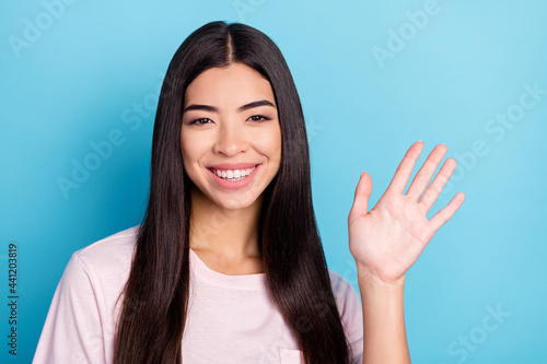 Photo of adorable satisfied brunette girl arm palm wavy look camera toothy smile isolated on blue color background