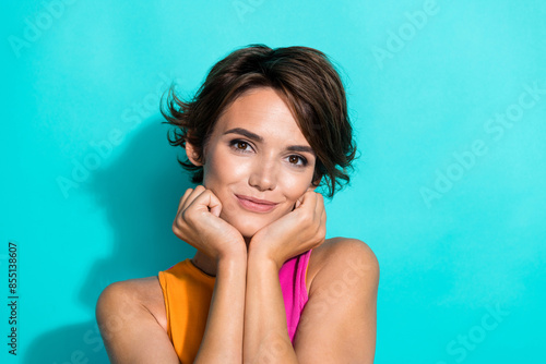 Photo of adorable sweet lady dressed colorful top arms cheeks empty space isolated turquoise color background