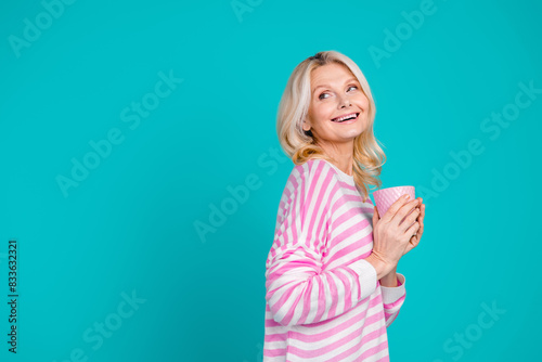 Photo of adorable woman with blond hair wear striped shirt holding mug of coffee look empty space isolated on blue color background