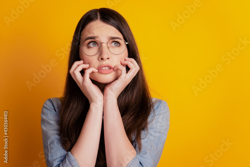 Photo of afraid girlfriend driven mad look up empty space isolated yellow color background