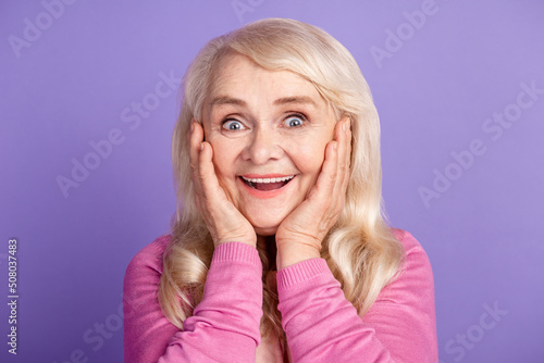 Photo of aged excited cheerful woman hands touch cheeks reaction isolated over purple color background