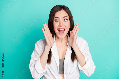Photo of amazed excited shocked young woman surprise gift unexpected isolated on teal color background