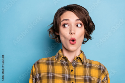 Photo of amazed funky girl open mouth look empty space wear checkered shirt isolated blue color background