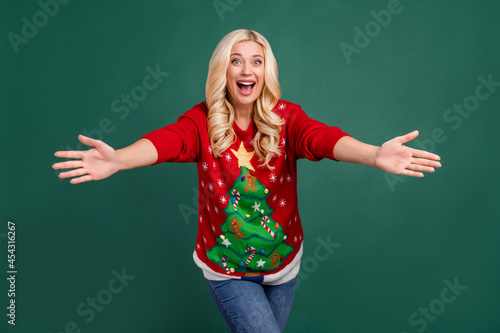 Photo of amazed shocked young happy woman open hands you good mood xmas isolated on green color background