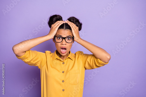 Photo of amazing pretty dark skin lady holding hands on head not believe awful bad news open mouth wear specs yellow shirt isolated on purple color background