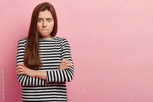 Photo of angry European lady keeps lips pressed, hands folded over chest, looks with annoyed expression, wears striped black and white jumper, isolated over pink background with copy space for text
