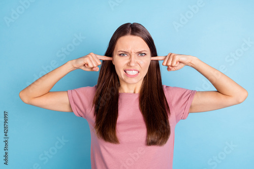 Photo of angry mad unhappy young woman avoid close ears fingers bad mood isolated on blue color background
