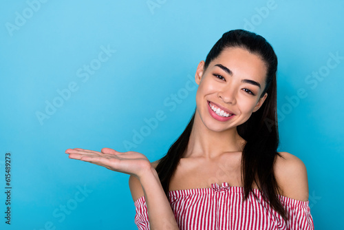 Photo of asian girl model showing on open arm top beauty product salon store presentation isolated blue color background