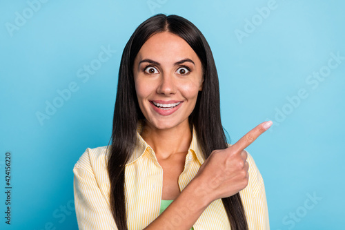 Photo of astonished pretty lady beaming smile indicate finger empty space isolated on blue color background