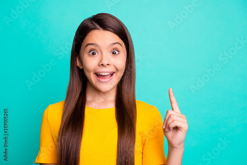 Photo of astonished small kid girl get incredible idea raise index finger wear yellow outfit isolated over teal color background